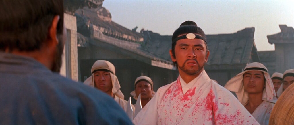 Bereft of the smooth action choreography of Lau Kar Leung, Wang Yu and his action directors (Kwan Hung and Siu Bo), fashion a far more chaotic and ugly version of war than many similar films. Instead of Wang Yu being the focus, having his heroic actions slay swathes of enemies, and he alone saving the day as his victims wait their turn to have their lives ended, there are wide shots showing multiple fights happening in a disorderly mass with no single focal point taking centre stage. Wang Yu has all the actors, including the stars, stand toe-to-toe with the extras as the camera pans across the bloody battle, and each star would periodically have a moment, but these would be fleeting as events hurtle towards a fatal conclusion.