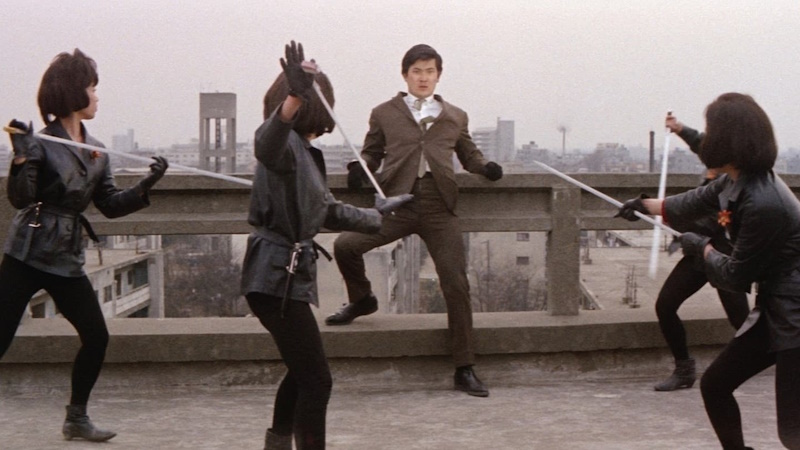 The action follows Japanese war photographer Daisuke Hondo (Akira Kobayashi), a charismatic lady’s man with more brawn than brains. Whilst flying back from an explosive stint in Vietnam, he impulsively asks out air stewardess Yoriko (Chieko Matsubara) and lands a date with her as soon as the plane hits the tarmac. Yet what should be a magical night is delayed by Hondo being framed with the murder of a Filipino hoodlum in the restaurant alleyway, perpetrated by three black tight-clad female ninjas, and when Yoriko is kidnapped moments later by another rival gang, Hondo’s head is sent spinning between trying to clear his name, getting his new girl back and generally fighting for his life in the middle of a mystery that seemingly has no beginning or end.