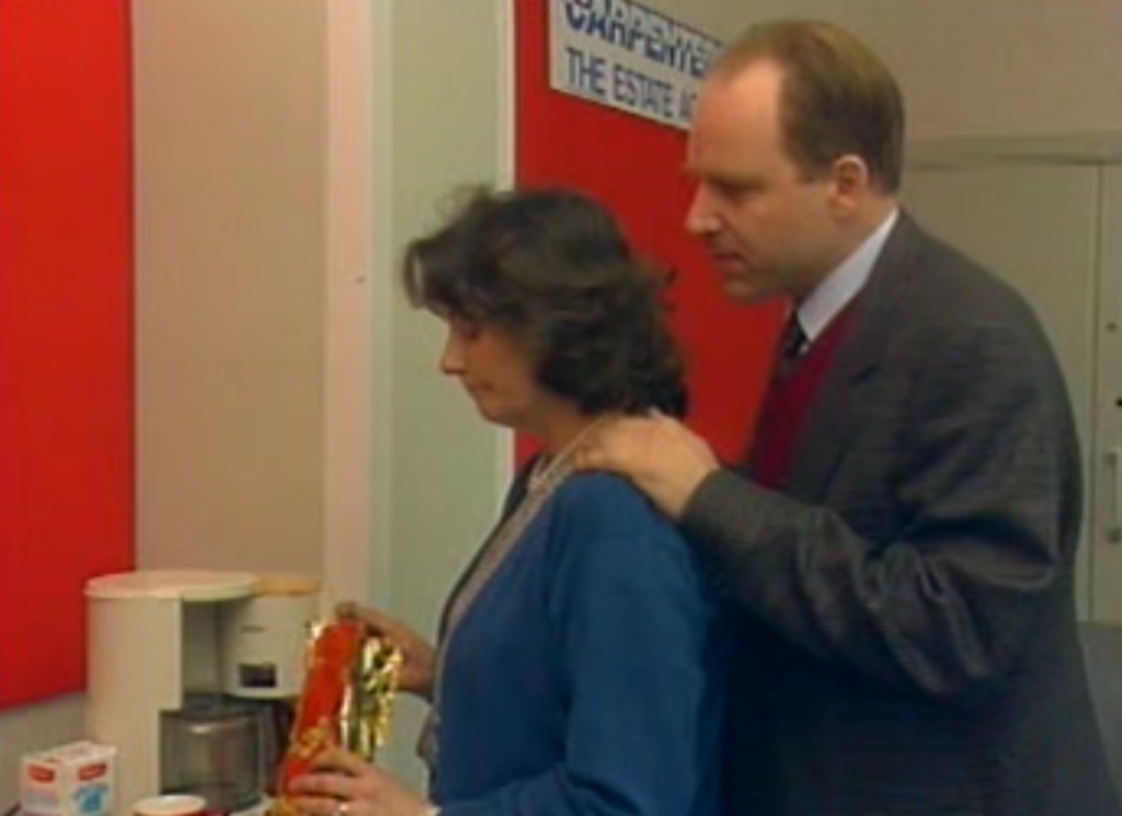 The A storyline focuses on a married, professional couple, Henry and Anne Carpenter, portrayed by Geoffrey Bateman (Dymond in 1979 Tom Baker serial Nightmare of Eden) and Jenny McCracken. The pair have relocated both themselves and their estate agency business from London to Holby for a fresh start but, on their first day in the area, their dreams are cut tragically short when a lorry driver’s brakes fail and he collides with Henry, sending him through the window of his shop. This is a brilliant stunt, arranged by Gareth Milne (whose name had regularly cropped up in the Peter Davison era of Doctor Who, most notably playing the disfigured George Cranleigh in 1982’s Black Orchid) and both this setpiece and its ensuing gore (as the paramedics arrive, Henry’s neck pumps blood; the result of the lacerations from the show window) are indicative of the quality of some of the setpieces that the show prided itself on and the flair for action that director Andrew Morgan had previously shown in bringing Aaronovitch’s Remembrance of the Daleks to the screen.