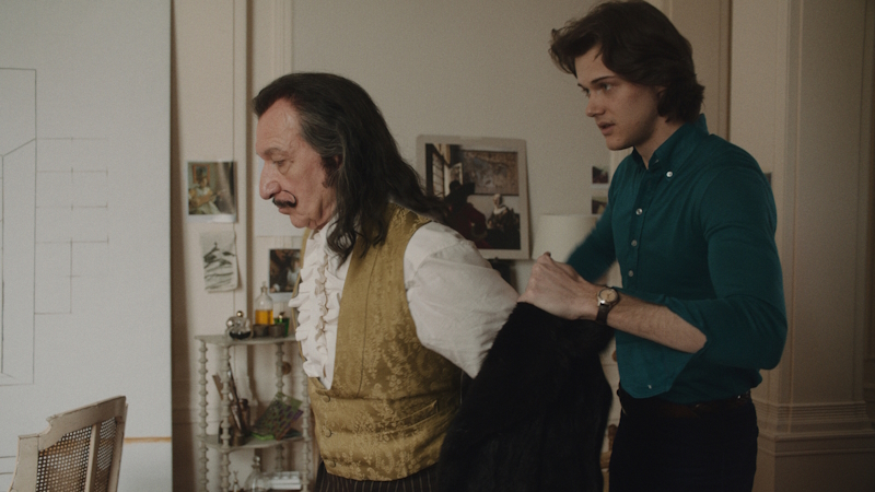 Using James as an anchor is the strongest element of Harron’s film as his sustained wonder over the art created and shock at the hedonism, and indeed the absurdity, of the artists’ world is balanced with the practicalities of the business. This wonder includes Dali’s (very specific), methods as well as flashbacks to a young Dali (Ezra Miller), and Gala (Avital Lvova) – which sometimes shift from day to night or vice versa. Notably, these flashbacks keep the present-day figures in the frame, such as when Dali and James observe the young Dali gaining inspiration for his most famous painting, The Persistence of Memory, in a suitably surreal sequence that features melting cheese and a clock projected on a wall.