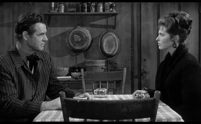 Using the three-act structure to literal effect, Day of the Outlaw initially sets its stall like the garden variety pre-50s Westerns more concerned with melodrama. While this is perfectly serviceable and saw the genre become the biggest at the time of its making, it doesn’t particularly do anything to endear the characters or their plights. For the first 20 minutes, the plotting of this Western drama is overfamiliar to the point of boredom. At which point, De Toth displays a subversiveness that sees Ives and his gang of military deserters walk into the bar stopping the previous bland western niceties from progressing any further. With the arrival of these classic Western outlaws, De Toth’s film evolves into a town-wide kidnapping picture fronted by a gang deprived of women and alcohol making an already hard situation for the town folk almost unbearable.