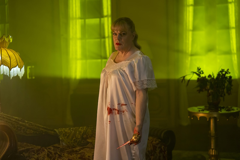 While Izzard grabs the headlines, Scott Chambers proves a more than capable foil and even manages to steal several scenes from Izzard as her new hired help, Rob. While he had worked with Stephenson previously on Chicken, Chambers has also built up his own horror back catalogue as director and producer, most notably Winnie the Pooh: Blood and Honey. A familiarity with the genre and clear willingness to lean into the outlandish side of horror pays dividends here as Chambers gives a performance that easily slips between realism and melodrama.