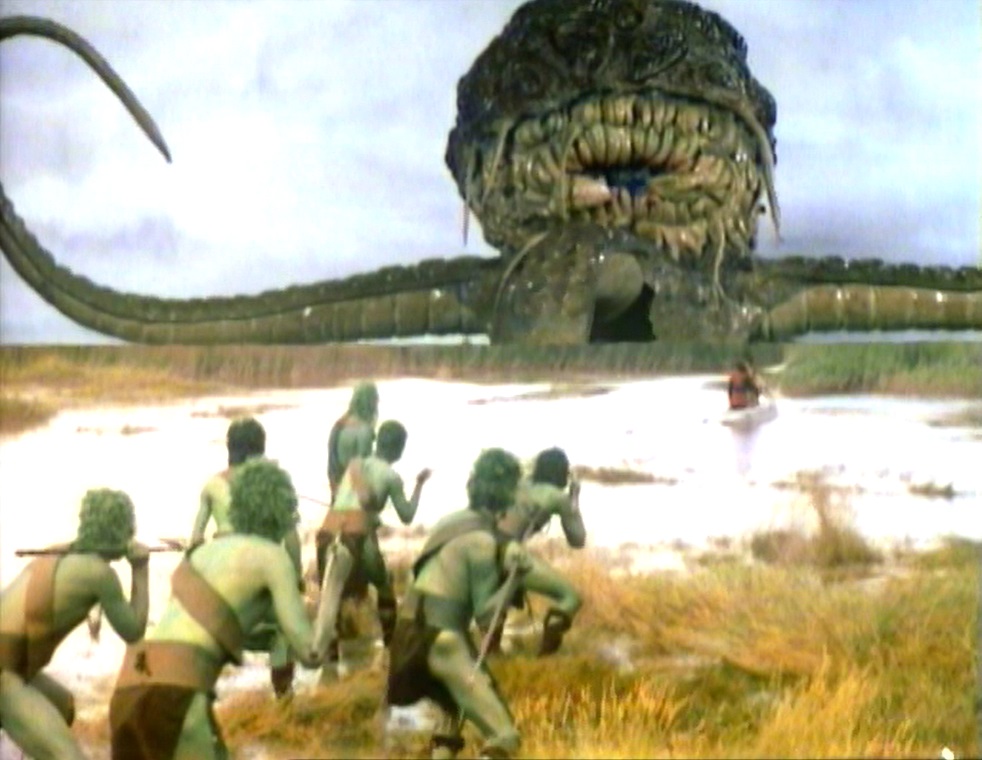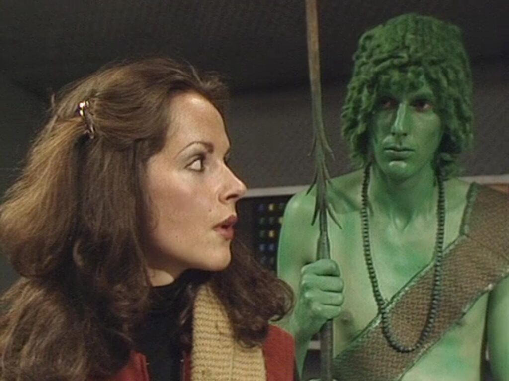 Actually, a lot of the common criticisms about it are dead on the money. The main failing is Kroll itself, which producer Graham Williams wanted to promote as “Doctor Who‘s biggest monster ever”. That it is, but the pitfalls should have been obvious from the second, third and fourth-biggest monsters; without a movie-sized budget for miniatures and mattes, 1970s effects will simply not allow a giant monster to be satisfyingly integrated into the action. The model of Kroll towering over the horizon isn’t bad, if transparently the product of blue-screen work; the scenes of refinery workers being thrown around by its tentacles have a pleasing Fury from the Deep quality. The problem is they don’t work together. At no point are those tentacles the right size to belong to the creature the Swampies are worshipping.