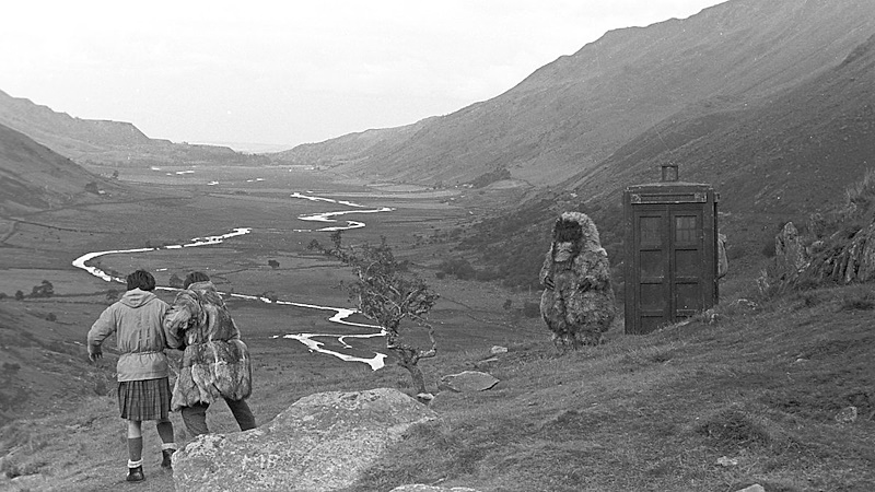 Back in the William Hartnell days, Doctor Who managed to get around the world on the wings of audience expectations: people in the early 1960s didn’t mind if a television serial used a soundstage with a painted backdrop to represent an Aztec temple. Even by 1967, though, audiences were starting to demand more realism, so in The Abominable Snowmen director Gerald Blake headed to the mountains to shoot the exterior scenes. Not those ones, though: they’re shot on some grassy Welsh mountains with a rather sub-Himalayan smattering of snow. This matters less now, because at the time of writing all but one of the serial’s six episodes are missing. The version of The Abominable Snowmen I watched was the animated reconstruction from last year, one which adds some extra snow and crags to the outdoor scenes. What it can’t do, because it’s tied to the pacing of the original recordings, is make the titular robot Yeti any faster or scarier.
