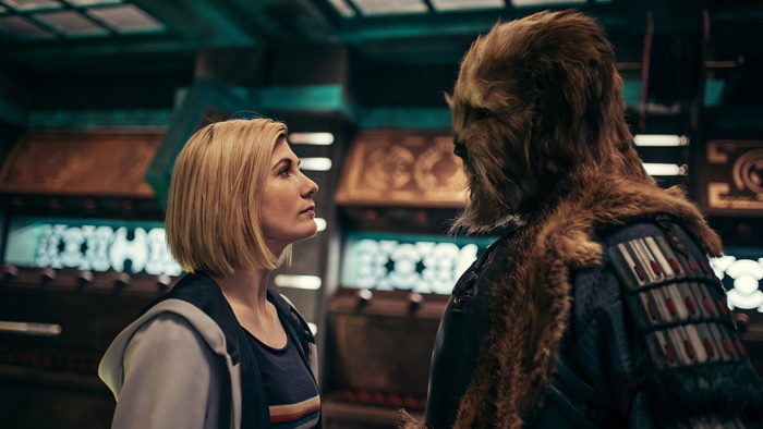 Meanwhile, on present-day Earth, viewers will recognize our well-advertised new companion, Liverpudlian Dan Lewis (played by comedian John Bishop, replacing comedian Bradley Walsh and doing his best to serve floppy-haired Disney prince energy). He’s in the process of being kicked out of the Liverpool Museum because he just loves his hometown so much he spontaneously breaks out in unauthorized tour guiding, the poor man can’t help himself. Cheeky chappy Dan does make a date with the actual museum guide who kicks him out (oh Dan, you cad, women love unauthorized tour guides, but we know you’re not keeping that date) before heading off to put a shift in at the local food bank to ensure the good people of Liverpool have sustenance on Halloween. Dan turns down the offer of a tin of soup as he leaves, even though we then find out his cupboards are bare, as he gives the last edible items in his house to trick or treating children. I think Formy-born Chibnall’s keen for us to know that Liverpool is awe-inspiringly amazing and that every man Dan is basically the best person who has ever lived. He’s even nice to a thirty-year-old trick or treater (with 12 perfectly good eggs in his hands, Dan must have been salivating) and then to Karvinista, who bursts through and destroys his kitchen door and reveals his true face – that of a large, bipedal, Shih Tzu terrier cross whose mouth only occasionally moves when he speaks with his amiable Northern English twang.