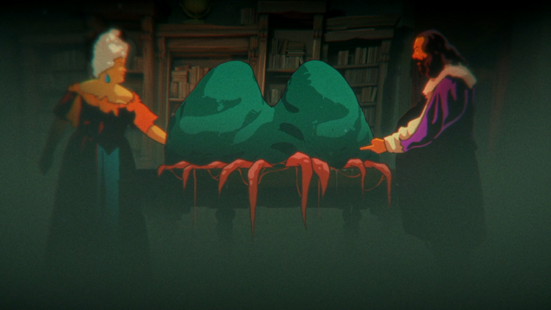 Despite the intriguing points of difference that Dog Of God has compared to other works, it also sadly falls into generic tropes every now and then too. In amongst all the grotesque and shocking imagery is a fairly played-out and paint-by-numbers witchcraft accusation story, which wouldn’t feel as cliched as it does if it wasn’t surrounded by an animated film trying its damnedest not to be normal. Again, this would provide the film with a really interesting moral debate: how can this bartender possibly be tried and found guilty of witchcraft, when we know for a fact that the villagers are engaging in far more debauched acts? Quite honestly, witchcraft is the least of this village’s worries. And yet there’s not enough confrontation about these issues for the narrative to feel like it’s achieving anything substantial.