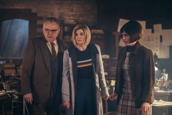 We open in a retro scientific environment, the broadcast date of November 21st being noted (exciting if you watched it on the date, pointless otherwise). Claire Brown (a great performance by Annabel Scholey, she’s companion material), previously spotted in episode 1 recognizing the Doctor and Yaz and promptly getting zapped by an Angel, being subjected to a lie detector by the dramatically named Professor Eustacious Jericho (played admirably by Kevin McNally). The machine must be broken because it claims she doesn’t believe that it’s 1967, or that she was born in 1935. She’s there because she’s having psychic seizures, although what Jericho thought he could do about it other than observe, we’re not sure. Meanwhile, a few folks are milling about outside in this dark English village looking for a missing child and a priest is left a rather ominous note to ‘Leave now’. It’s all very ‘A Ghost Story For Christmas’, but without the festive spirit.