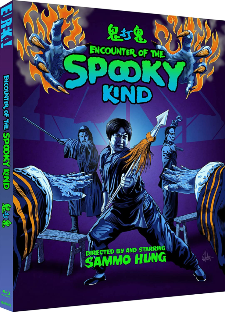 Sammo is much more than Jackie Chan’s friend and co-collaborator and the butt of so many fat jokes in the 80s and 90s, he also happens to be one of the best action directors Hong Kong cinema ever produced. At his peak he was just as good behind the camera as he was in front of it, probably better behind, to be fair. His films could typically be planted in the style of hong kong action cinema that made Jackie Chan the most famous actor on the planet or more backwards-facing movies that recalled the halcyon days of the Shaw Brothers. Of course, there are notable exceptions too, two major ones come in the shape of – the still hard to track down – Pedicab Driver and the wonderfully idiosyncratic Encounters of a Spooky Kind. The latter of which is getting released by Eureka completed by a flamboyantly striking art commission by Darren Wheeling adorning the slipcase.