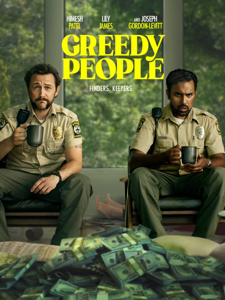 Will (Himesh Patel), is a cop who’s starting his first day on the job after moving into a small coastal town with his heavily pregnant wife Paige (Lily James), making Greedy People the second pairing for Patel and James as a romantic couple after Danny Boyle’s Yesterday (could they be Britain’s Gosling/Stone combo?). Will gets saddled with a walking red flag of male insecurity and over-friendliness called Terry (Joseph Gordon-Levitt), as a partner. He shows Will the ropes of what it means to be a cop in this town, namely which stores give the police free coffee and donuts, and to stay in the car while Terry sneaks off with a married woman whose husband is at work. Things quickly take a ridiculous yet unsurprising turn when Will investigates what he believes is a home invasion in progress, and of course events escalate quickly when, all of a sudden, Will somehow accidentally kills the wife of the wealthiest man in town – fishing magnate Wallace (Tim Blake Nelson). Roll the title card.