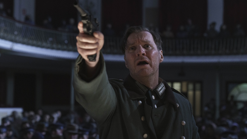 Whereas in Buried, still arguably his best known film, Cortés operated within the extreme restraints of a single setting and single on-screen actor (it’s basically Wrexham FC’s owner Ryan Reynolds in a box for 90 or so minutes) here he flexes his muscles and rises to the challenge of splitting the film into two strands, adopting a ‘play-within-a-film’ structure that allows the action to switch back and forth between the realities of the troupe and their performance of Jurandot’s musical. To that end, the audience are getting two stories for the price of one; the quandry that Stefcia finds herself in backstage and the all-singing and dancing farce presented on the boards out front, each with moments that purposefully resonate with one another. Meanwhile the on-screen audience of downtrodden Jewish souls and the amatuer players performing for them are visibly peturbed to find one of their occupiers, a rifle-wielding Nazi, Magnus Krepper’s Szkop, has found his way into the auditorium to witness the play.