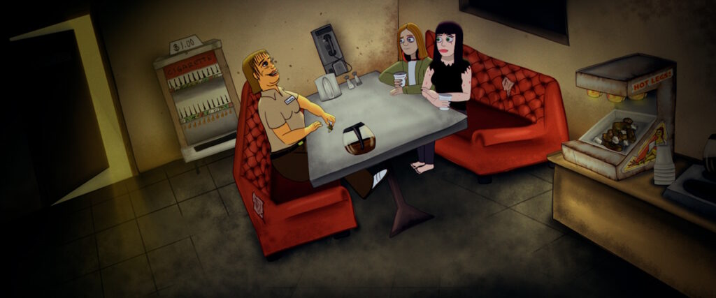 As for what it is, The Weird Kidz sees Wyatt, Fatt, Dug, and Mel (and his amazing pet dog), head out into the desert with Mary to drink booze, let off some explosives, and the eldest teenager among them might even be lucky enough to get laid. Unfortunately, they picked a strip of land home to something the locals call the ‘Night Child’ – a creature with a refined taste for human flesh. More than just a creature feature, the folk horror vibes start off strong with a shop assistant at a petrol station along the way (voiced by Angela Bettis), giving a strangely complete vision of what the Kidz may experience later that night. They very quickly learn the truth of that “foretelling” when a giant ant creature attacks Dug, drugging him and dragging him back to its network of caves before returning for Wyatt, and it’s then that the folk horror conspiracy begins to close in on the Kidz.