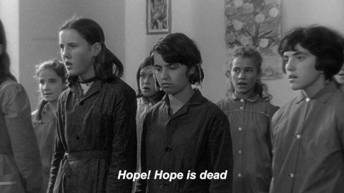 Au Hasard Bresson brings us back to the matter of Bresson’s skill at self-analysis. It should be pointed out that he’s not didactic even when talking about his own process; at one point he begins a sentence with “In my opinion, which you don’t have to share…” which is not a sentence fragment Godard has ever uttered. Still, the documentary is endlessly illuminating about the craft and intent of Mouchette. Bresson explains that he gives his non-professional cast leeway to improvise but rigorously works out the structure and meaning of each scene beforehand, describing the desired effect as “unlimited surprises within a limited context”. He says he liked Bernanos’s novel because it focused solely on the actions of a character within a stressful situation, rather than trading in “psychology in literary form”. Mouchette is, perhaps, readable as a work of nineteenth-century naturalism rather than cinematic realism, a throwback to the way that pre-Freudian writers like Zola or Balzac focused on a character’s environment above their inner life.