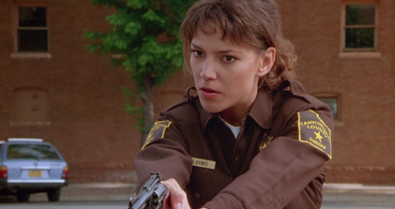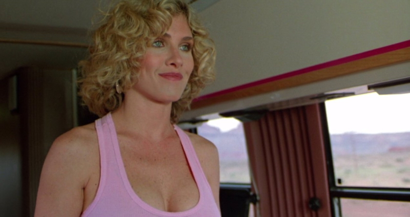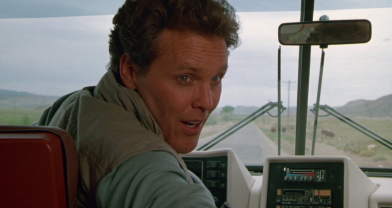 Less interesting, admittedly, are the film’s characters. Hauser is fairly bland and forgettable as the film’s leading man, taking a back seat to Hopkins’s tough-as-nails Dirty Harry-type “good guy with a gun”. Hopkins is fun enough in the role, though his very of-its-time action hero might not charm as much as he would have back in the ‘80s; his attitudes towards women are frequently questionable, though they seem to charm the film’s unlikely romantic lead Julia (Pumpkinhead’s Kimberly Ross), and his compulsion to drop one-liners at the sight of violence often comes off as more cold and uncomfortable than charismatic and funny – well, at least funny in the way that was intended. It’s nice to see Blade Runner’s Brion James in a small role as “the Albino”, the villainous John Carpenter lookalike and the brains behind the Canyonland operation, though the character’s condition being used simply as a means of making him look more “evil” hasn’t exactly aged well. In terms of how Nightmare at Noon might appeal to modern sensibilities, it’s an interesting beast; for all of the jokes in its script at the expense of the FBI and law enforcement, some of which cut fairly deep, it could easily be argued that the film is a cut-and-dry example of “copaganda”.
