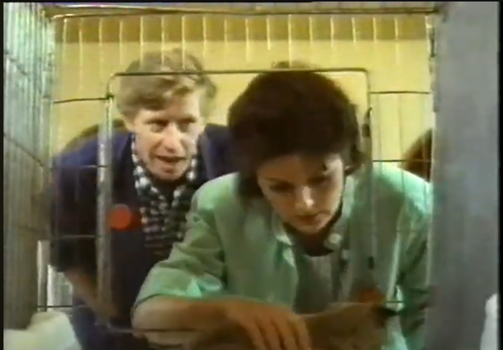 This is great stuff, and Wyatt has the cast to make it shine. Aside from the ever-reliable Blethyn, Simon Jones of Hitch-Hiker’s Guide to the Galaxy fame appears as her husband, and Mrs. Venables is played by Doreen Mantle, just three years before she found sitcom immortality as Mrs. Warboys in One Foot in the Grave. Wyatt has a particular gift for writing comic roles for actresses of Mantle’s age, which is why his Doctor Who stories have such fantastic older performers in them: Peggy Mount in The Greatest Show in the Galaxy, Elizabeth Spriggs in Paradise Towers. Those stories also have fantastic roles for young and middle-aged performers, though, and that’s perhaps what’s lacking in Claws. The battle between the grande dames of cat-breeding takes up more and more of Wyatt’s focus as the story goes on, to the extent where even a younger performer as good as Blethyn can’t fully take control of the narrative.