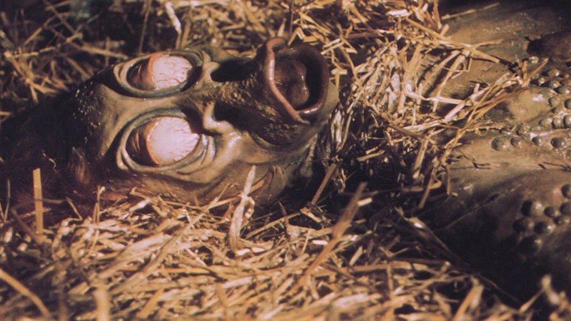 That all being said, The Mutations is overall a bit of a disjointed mess that features weird sluggish pacing, too little monster action, unsympathetic teen leads, an unexpectedly rushed finale, and – most egregiously – a treatment and portrayal of disability which comes off as extremely exploitative. Where Browning’s Freaks would treat its disabled stars with respect and empathy almost half a century prior, The Mutations depicts difference and disabled bodies with a leering lens, at one point even turning into a genuine screen version of a sideshow as the audience-surrogate leads are seen flinching and grimacing in disgust at the sight of a woman with ichthyosis; it’s a vile moment, though unfortunately not the worst of its kind that I’ve seen, the dishonour of which goes to a scene in Ron Ormond’s Christ-sploitationer The Believer’s Heaven (1977). There’s a degree to which the film half-heartedly attempts to make up for this and criticise ableist attitudes, largely through Baker’s character, a self-hating man with a facial difference who torments his “freak” employees because of his obsession with becoming “normal” (there’s nothing to say either way if filmmaker Aaron Schimberg watched this film prior to directing A Different Man, but it’s mildly amusing to consider that possibility), but by the end – regardless of Baker’s passionate delivery – his character largely ends up being just another example of a villainous character whose face is made “ugly” to “match his personality”, not helped by the number of shots in which he can be seen drooling. In spite of my deep love for Baker as an actor (and Doctor), his Lynch is no Elephant Man.