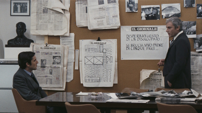 There’s a scene in which Volonté’s editor character schools Roveda, the idealistic young journalist played by Fabio Garriba, about a story he has submitted – the headline of which reads ‘Desperate Gesture as an Unemployed Father of Five Sons Sets Himself on Fire’. That simply won’t do for Bizante or, he argues, the paper’s middle-class readership. He explains how ‘Desperate’ in conjuction with ‘Unemployed’ is a provocation likely to challenge or even punish the hypothetical reader, unsettling them about society and making them feel somehow personally culpable because of their bourgeois lifestyle, values and beliefs. Far better then to say ‘Dramatic Suicide’, as it not only uses less words, it also keeps the gory details of his death beneath the headline. Bizante knows that it is the headlines that people read, and that they must be designed to give the people the choice to read on or not. Also, because the man was from Calabria, Bizante reasons that they should identify him as an ‘Immigrant’, arguing that this is a useful one word description that also implies he was an unemployed family man. He also suggests removing the reference of the suicide victim having been ‘fired’ from the article, and a browbeaten Roveda suggests ‘left without a job’ by used instead. Bizante is happy. In one fell swoop they’ve now provided the palatable essence of the tragedy, whilst ‘othering’ its protagonist from the reader in such a manner as to remove any responsibility from the door of his capitalist employer class. It’s a brilliantly well done scene, that puts the whole film in a nutshell. Furthermore, you just know that rags like Daily Fail and the S*n would happily show this scene as part of the training of its ‘journalists’.