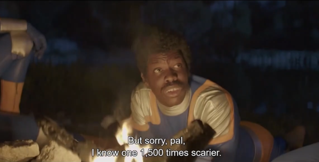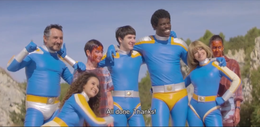 Didier warns them that a powerful alien warlord – played, in an extended cameo, by Man Bites Dog‘s Benoît Poelvoorde – is on his way to Earth. Tobacco Force need to be in better fighting form in order to defeat him, so he packs them off to a team-building retreat. It’s a very funny idea, though the film never becomes the workplace comedy this twist seems to promise. Instead, Smoking Causes Coughing becomes an anthology film of sorts, as various team members and guests tell each other scary stories to pass the time.