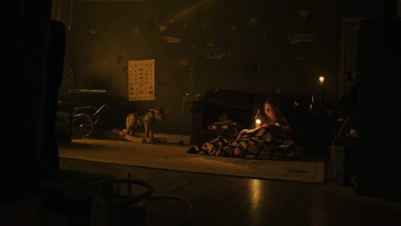 Whistle in the Woods is arguably the darkest of the episodes in terms of cinematography and colour palette, its moody aesthetic a stark contrast to the light and airy beginning at Nola’s house, and the change in tone happens on a hairpin. The angles and space becomes tight, focusing on the furniture and giving us a sense of the terrors being locked away, dying to be unshackled. The colour red appears again, but in subtler ways as the deep washes of it that alert us to massive danger are gone, and an alarm clock gives us the grounding we need – which is cleverly done. That’s all the red we need as there are rules to follow and times to be respected, and the alarm clock sits to remind us of those things so when a boundary is crossed, the creative team gives us layers of mimicry and outright malevolence.
