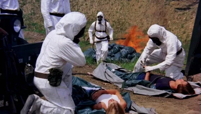 The Crazies opens on a farmhouse with two children playing in the middle of the night, interrupted by crashing furniture they run to their mother only to find her dead, killed by their dad who is now in the process of setting the house on fire. Not 5 minutes later the dad is crying about what happened, oblivious to the fact that he was the one that caused it all. This is what Trixie does and it’s in the towns water supply meaning its only a matter of time before the entirety of the town falls to this weapon. That is why the government sent a military presence and its also why Romero periodically edits in a slowly approaching plane carrying a nuclear payload, creating an effective ticking clock.
