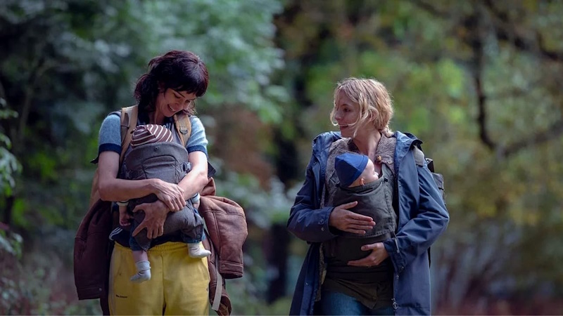 It isn’t just the connection between mother and baby that Belo’s film captures either, as there’s a very satisfying female friendship that plays out across much of the running time between Comer and her fellow new mum O, played by Katherine Waterson. Once again, and unsurprisingly given that the key creatives behind the camera on this – the director, four of the five producers, the screenwriter and the original author – are all women, The End We Start From captures something commonplace and domestically-minded for audiences, namely the maternal support network that mothers ordinarily develop in the community, and proceeds to write it large across the canvas of an environmental and societal collapse. The intensity of the bond between new mothers is an identifiable and relatable one, but when placed in this extreme context, it becomes even more so, with Waterson arriving just in time to boost Comer’s confidence and resilience, not only from the despair she feels as a new mum but also the despair she feels at the ravaged world around her. The scene in which they tramp through the hills cheerfully belting out Dirty Dancing‘s (I’ve Had) The Time of My Life like stragglers from a hen do that has long passed over the horizon is an especially charming one that nevertheless speaks to the importance of female solidarity and of boosting one another’s spirits.