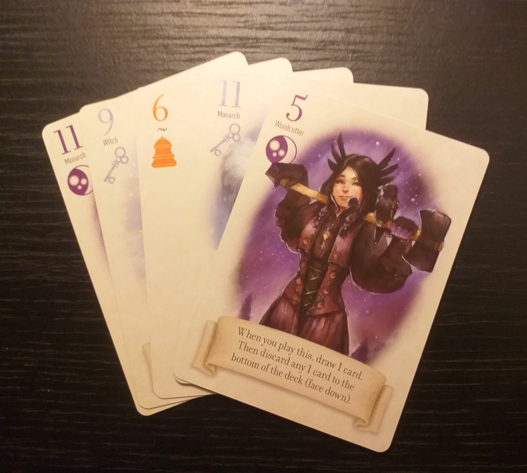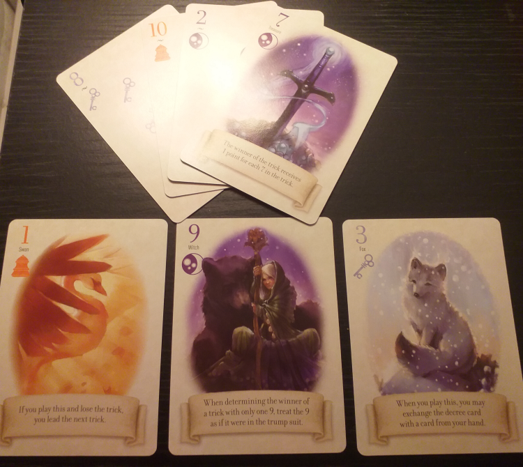 The Fox in the Forest features three suits that fit its fairy-tale theme – moons, bells, and keys. The artwork is gorgeously realised, especially for the odd-numbered character cards which allow you to use special powers. These, if played at the right time, can alter the course of the game. They allow you to swap cards, change who goes first, alter which suit is trumps, and other useful abilities. The names of the character cards – the swan, the fox, the witch, the treasure, the woodcutter, and the monarch – hint at mystery and magic with beautiful illustrations.