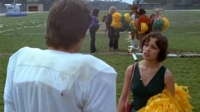 Which isn’t to say the film didn’t make me laugh. Hill claims to have finished filming The Swinging Cheerleaders about four months after he and Kidd started the script, and there are some howlers in the dialogue which do attest to a very sharp turnaround. Some of them are simple cliches, like the police officers who do actually say “Well, well, well, what have we here?” Others are more peculiar. In one early scene, Buck, a jock with a heart of gold played by Ron Hajak, is chided by a cheerleader he’s trying it on with, who tells him “You can’t treat women the same way you treat football players on the field!” Given that he was running his hand up and down her thighs just before she said that, you have to wonder how Buck plays football.