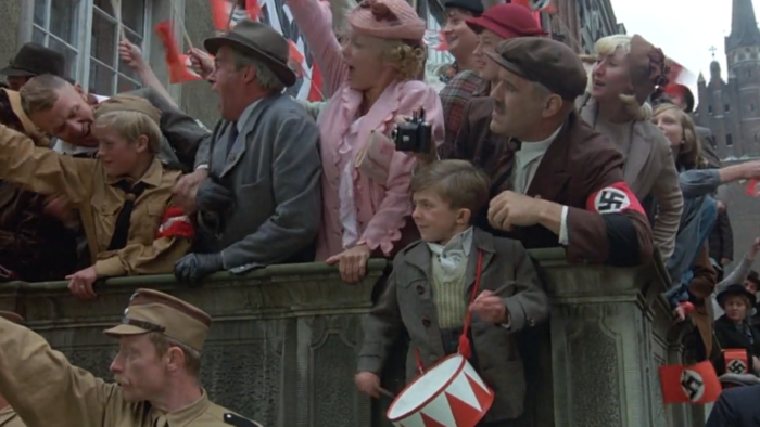 The first of these is the now rather iconic Nazi rally scene. Hiding beneath the wooden benches of the outdoor uncovered stand, Oskar begins to bang his drum; a contrasting metronomic beat from this mischievous gnomic figure that begins to confuse the assembled band of brownshirts. Slowly but surely, one by one, their musical accompaniment for the rally strays and finally mutates into a full-blown waltz. In that moment, the spectators give in to the innate pleasure of this more innocuous, fun-loving music and they proceed to dance together, leaving the Nazi spokesman out in the rain – quite literally, as a downpour develops – with Oskar having rained on his parade. It’s a joyous, satirical moment and Schlöndorff choreographs the chaos beautifully. The meaning is clear; this is a courageous little act of rebellion from Oskar who has seen the pomposity and hypocrisy of the rising Third Reich and decided it deserves his contempt. Ensconced under the benches, almost like a little sprite or hobgoblin, he cannot see the effects of his small act of dissent, but he can hear it and he is happy.