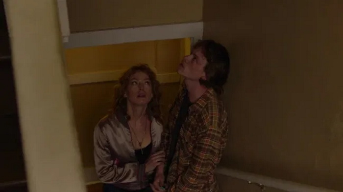 One of the subtlest directorial touches in episode 11 comes when Becky goes up to Steven’s apartment. A more conventional director would shoot this scene following either Becky or Steven. Lynch does neither, hanging his camera unsteadily halfway up the stairs until Becky runs up them, and the viewer is almost dragged in her wake. It creates a sense of uncertainty, refusing to tell us who the protagonist or the sympathetic character is in this scene. And then, in one speeded-up tracking shot, we find Steven hiding out in another stairwell with Gersten, seemingly the last remaining Hayward in Twin Peaks.