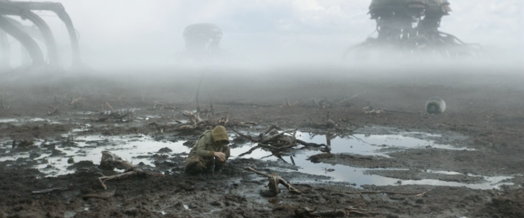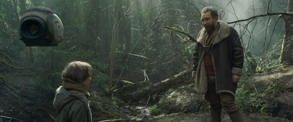 Vesper and her father were abandoned by her mother (before the events of the film), as she left them to join a silent order that wears black robes and combs the lands for scrap. We see them twice; they are nothing more than a background detail to flesh out the world. Eddie Marsan runs a small village that survives through a blood trade with the citadel. Pallid, mindless robots wander the wastelands, and one crashes into Jonas’s community. This devolves into a situation resolved by the town’s overseer forcing his youngest to kill the automaton to the jeers and cheers of a braying crowd – a real grim coming-of-age ceremony. The drone paired with a human’s psyche is not of wires, circuit boards and metal – its innards are an orange fleshy cavity. There are other vertical slices of world-building, but to detail them would mean jumping into third-act spoilers.