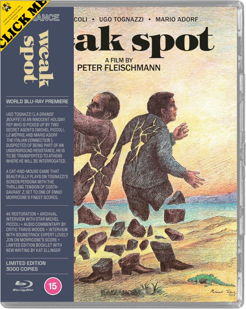 Radiance once again does admirable work this week, salvaging yet another classic piece of 70s European cinema from unfair obscurity. The Blu-ray release in question is Weak Spot, a 1975 co-production between France, Italy, and Germany, shot in Greece by director Peter Fleischmann. The film is based on a 1965 novel by celebrated Greek author Antonis Samarakis entitled The Flaw. Part thriller, part political satire, Samarakis used his novel to predict the approaching authoritarianism in his native Greece, which came to pass in 1967 when a right-wing military coup seized power from the caretaker government ahead of an election widely expected to be won by Georgios Papandreou’s Centre Union party.