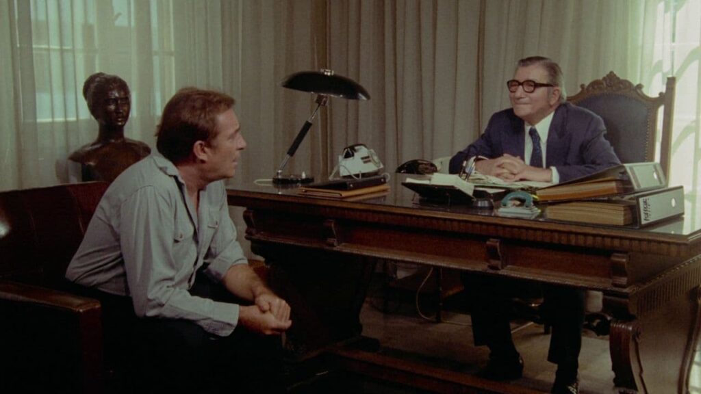 Italian actor Ugo Tognazzi stars as Georgis (the only named character in the film), a middle-aged tourist manager who enjoys a carefree and seemingly apolitical life – if the frolicking opening sequence with his girlfriend (Italian actor Adriana Asti) is any indication. However, all of this changes one Saturday afternoon when a stranger treads on Georgis’ foot in a bar. The brief spat that ensues between the two men attracts the attention of the nearby military secret police, leading to Georgis’ arrest. Bewildered, he is taken downtown, where the Chief of Police (Greek actor Dimos Starenios) accuses him of conspiring with the stranger – now labeled an accomplice – in an unspecified crime against the state.
